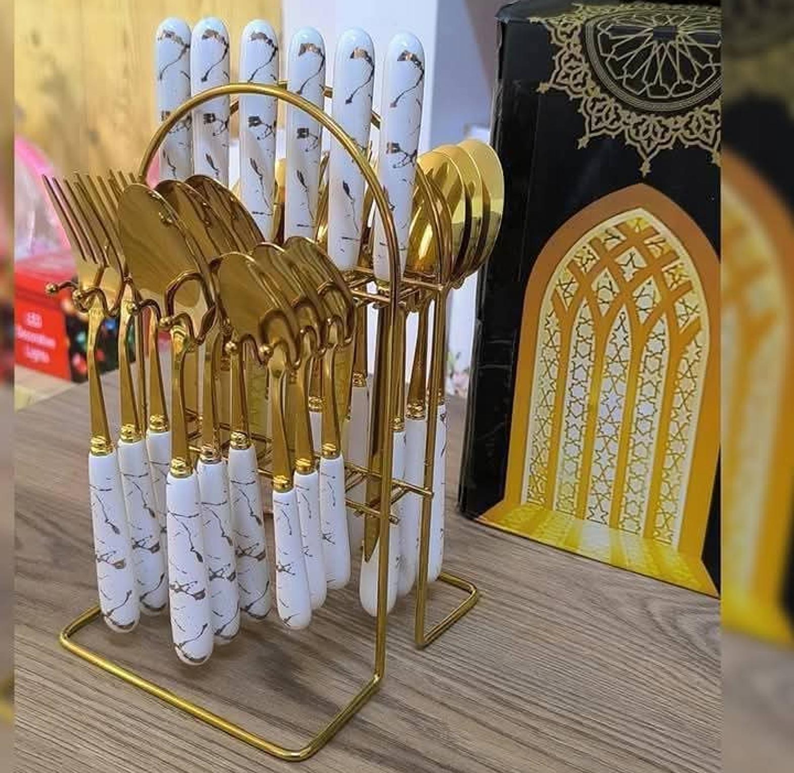 The Aura Marble 24-Piece Cutlery Set is designed to transform every meal into a feast for the eyes. This stunning collection provides service for six, including six dinner knives, forks, spoons, and teaspoons, all crafted from high-quality, food-grade stainless steel for exceptional durability and a comfortable, balanced feel in your hand. The set's unique appeal lies in its sophisticated color palette: a polished gold-tone finish is beautifully contrasted with a sleek white marble-patterned handle, creating a bold and elegant statement that stands out on any table. This sophisticated design makes it a perfect addition for both everyday dining and special occasions, adding a touch of glamour to your home. This cutlery set is not just a tool—it's a beautiful accessory that brings a fresh, luxurious aesthetic to your kitchen and dining room.