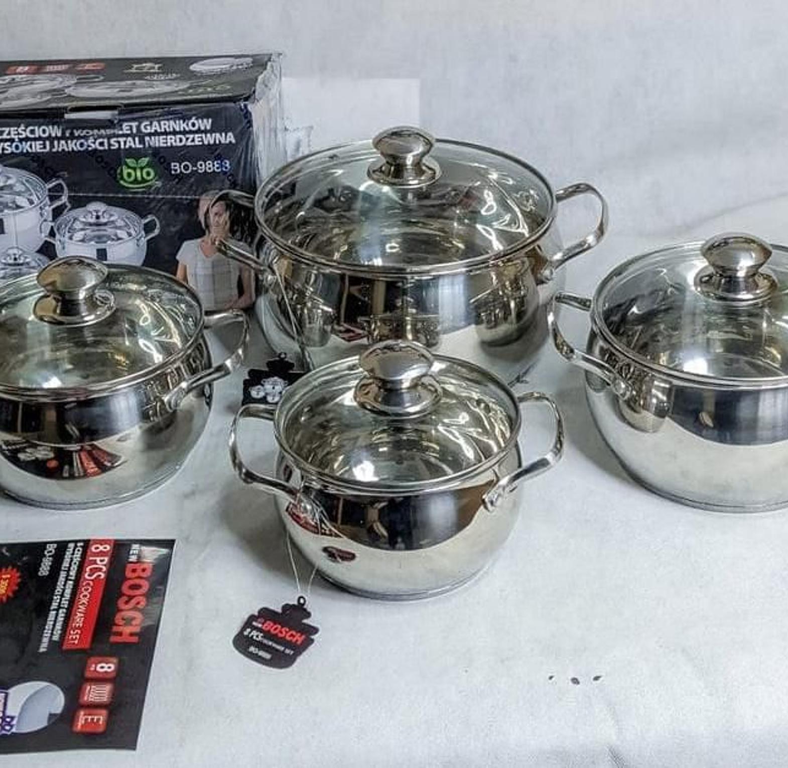 Bosch High Quality stainless steel 8pcs Cookware Set Premium stainless aluminium offers better cooking performance. Tight-fitting covers seal in moisture and nutrients. Ideal for open charcoal jiko or firewood cooking. Solid stainless steel riveted handles stay cool during cooking Durable and easy to clean