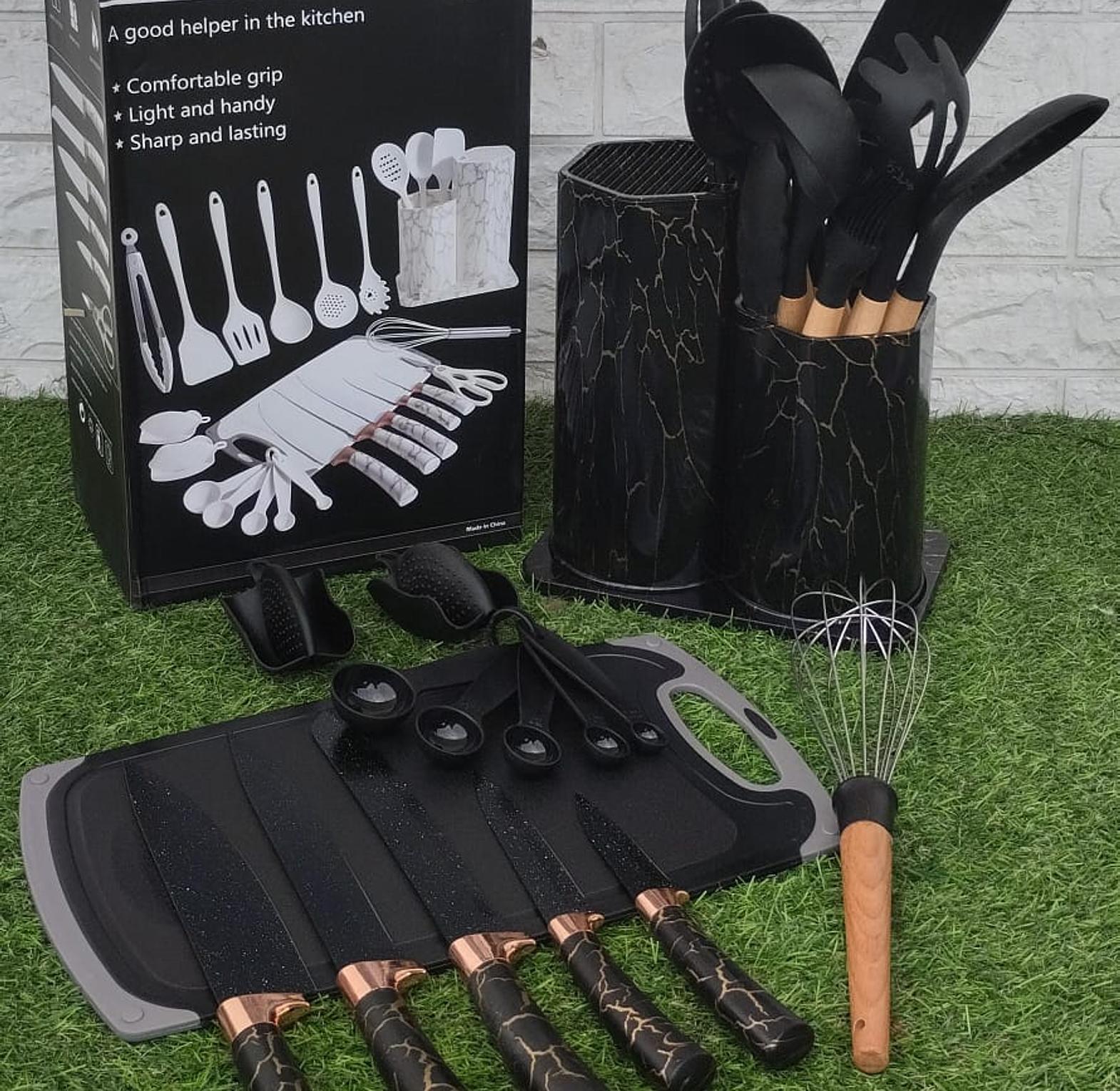The Onyx Marble 25-Piece Silicone Utensil Set is a complete culinary collection designed to elevate your cooking and baking experience. This comprehensive set includes a wide range of tools, from serving spoons and spatulas to measuring spoons and tongs. Each utensil features a sleek, black marble design that adds a touch of modern sophistication to any kitchen decor. Crafted from high-grade, food-safe silicone, these tools are not only non-stick and easy to clean, but they are also heat-resistant up to high temperatures, ensuring they won't melt, deform, or scratch your precious non-stick cookware. The ergonomic handles provide a comfortable and secure grip, while a convenient hanging hole on each piece allows for easy storage. This set is the perfect marriage of form and function, providing everything a home chef needs to prepare, cook, and serve delicious meals with confidence and style.