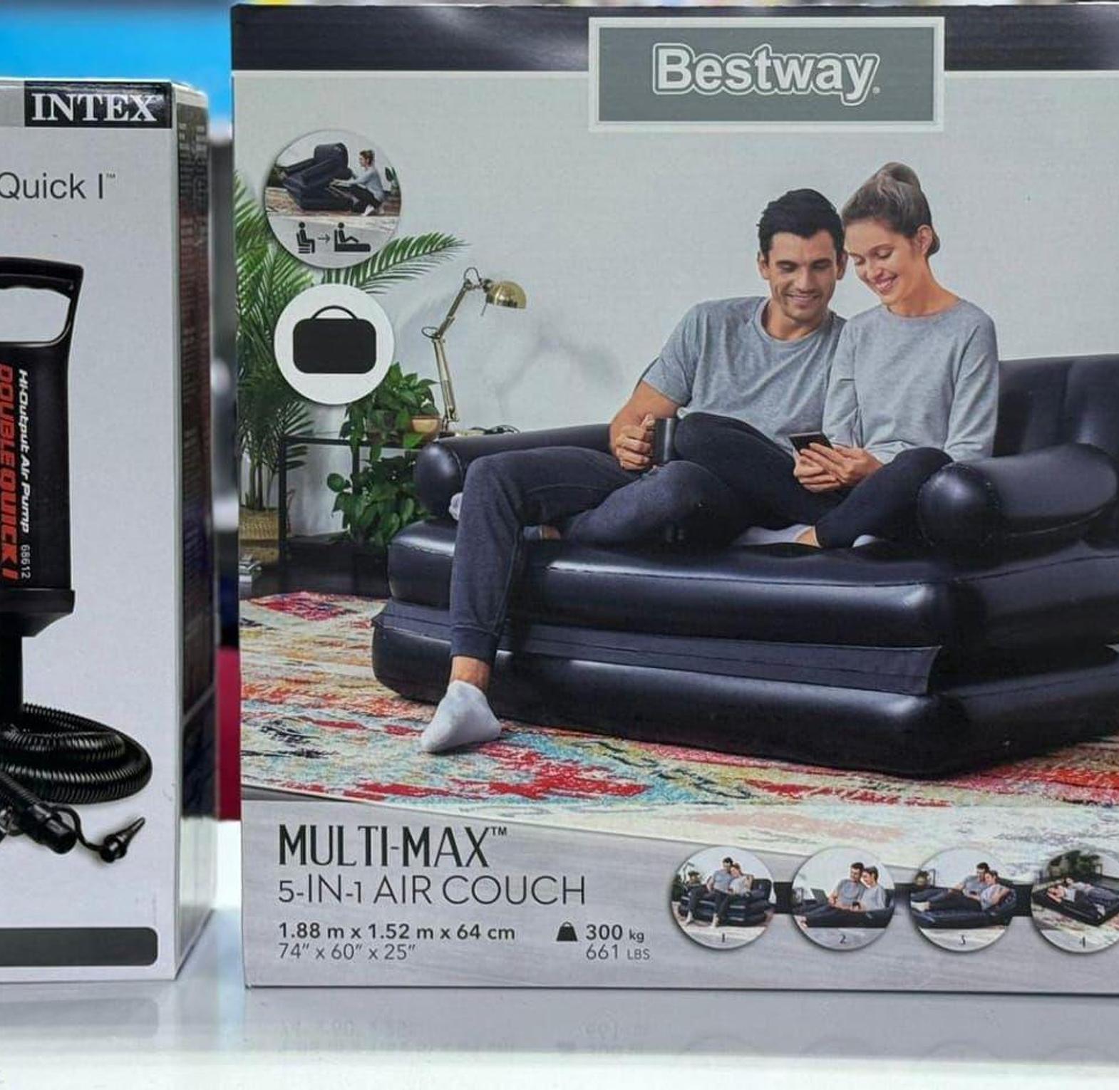 5in1 Inflatable Multifunction sofa-bed Great for indoor & outdoor use 2-way interlocking Quick release valve for fast, easy inflation and deflation. Inflatable pull out sofa bed (multipurpose) Easily portable