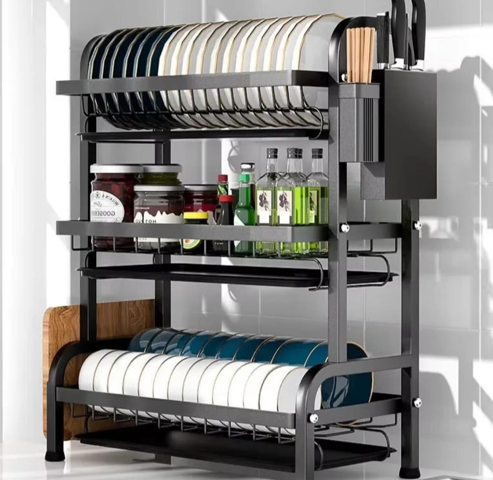 The Aero-Dry Pro is not just a dish rack—it's a complete kitchen organization solution. This advanced 3-tier rack is engineered to handle a full load of dishes with ease, combining a sleek, modern design with exceptional functionality. Constructed from heavy-duty, rust-resistant carbon steel and finished in a sophisticated matte black, it provides the durability and stability you need for everyday use. Its thoughtful design includes three spacious tiers for plates, bowls, cups, and pans, along with dedicated side attachments for a cutting board and a cutlery holder, ensuring everything has its place. The Aero-Dry Pro features three individual, removable draining trays at each level, which effectively catch excess water and keep your countertops spotless. With its space-saving vertical structure and easy, tool-free assembly, this dish rack is the perfect upgrade for any kitchen, turning a daily chore into a seamless and stylish experience.