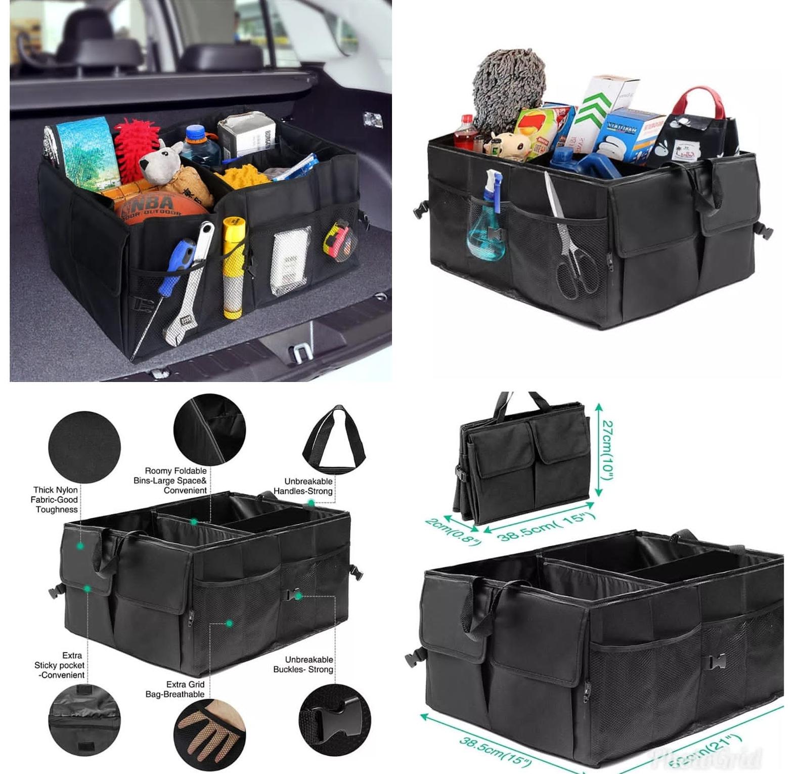 A high-quality car boot organizer with multiple compartments designed to neatly store and secure all your essentials.