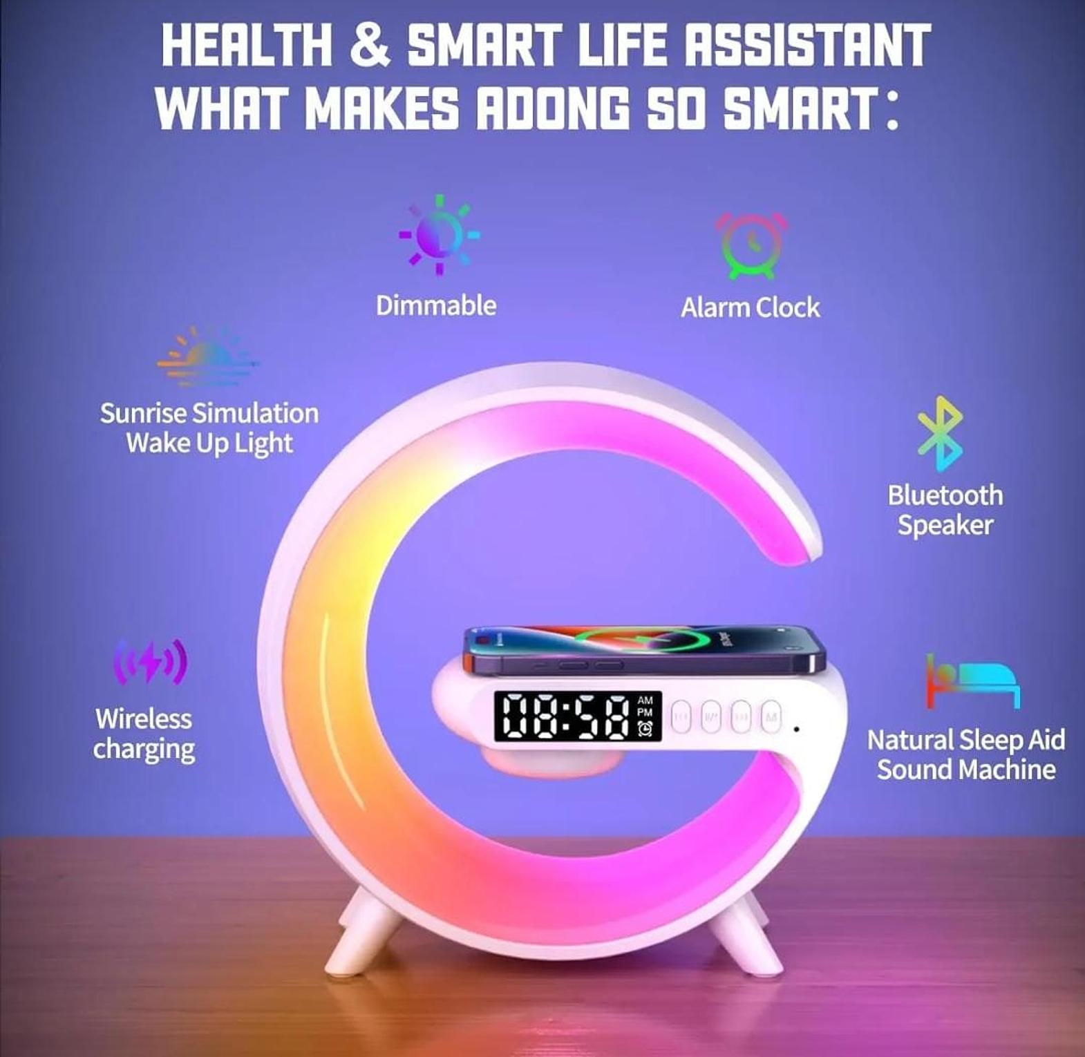 A versatile LED smart light with built-in Bluetooth speaker, wireless phone charging, and FM radio for a complete modern experience.