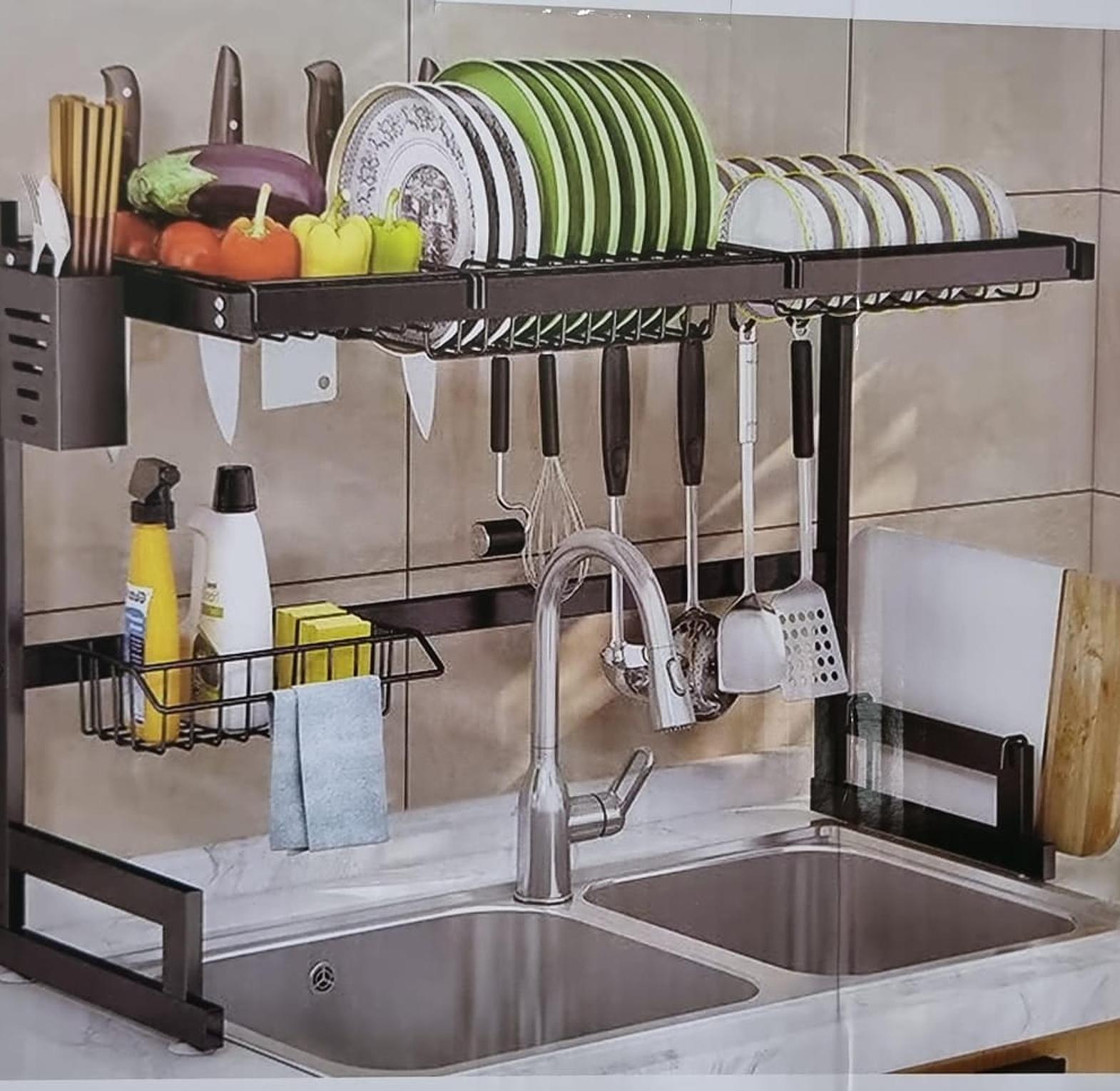 Maximize kitchen space with this durable, rust-resistant metallic rack that fits perfectly over your sink.