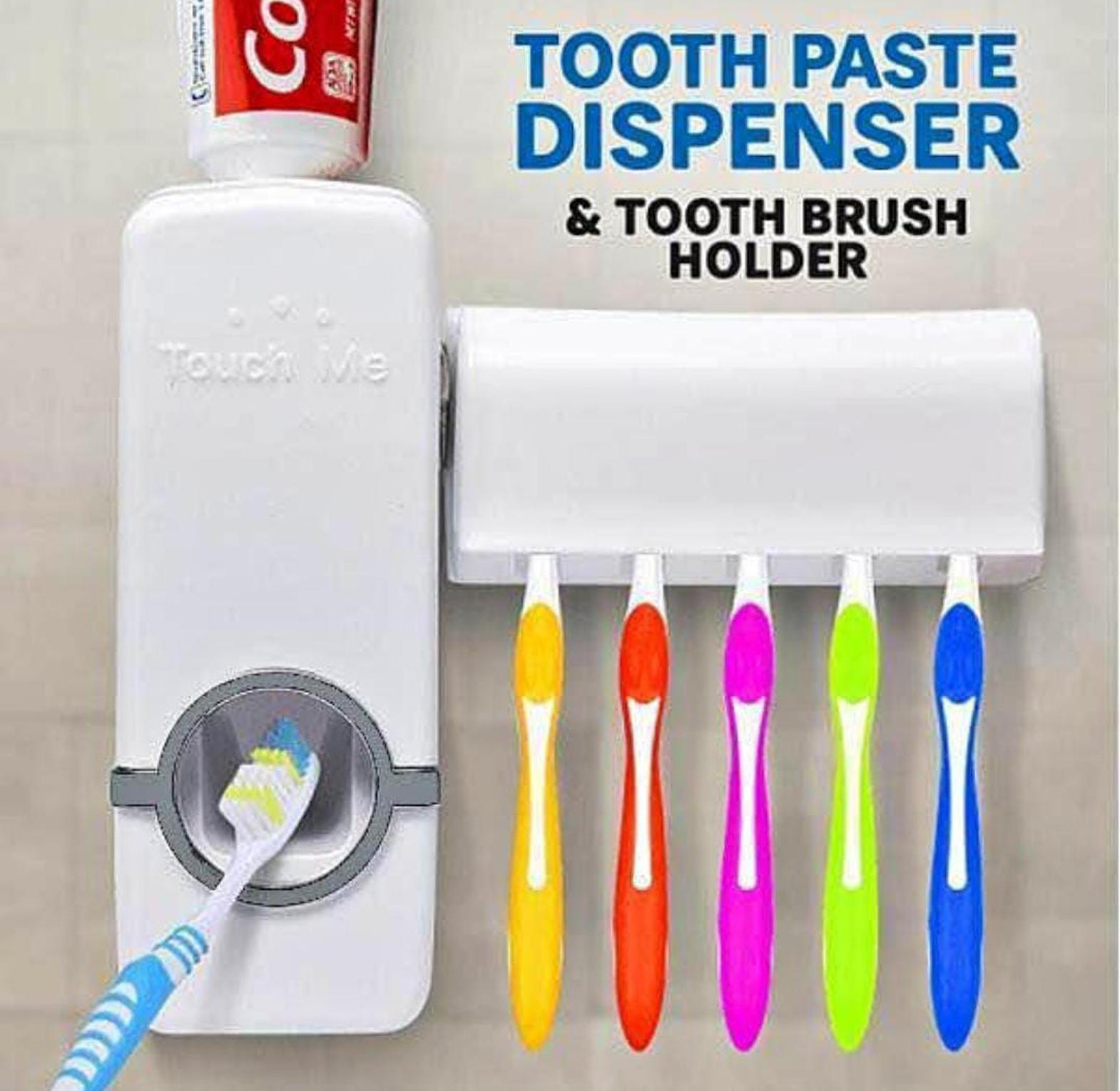 A wall-mounted toothpaste dispenser with a 5-slot toothbrush holder, designed to keep your bathroom tidy and organized.